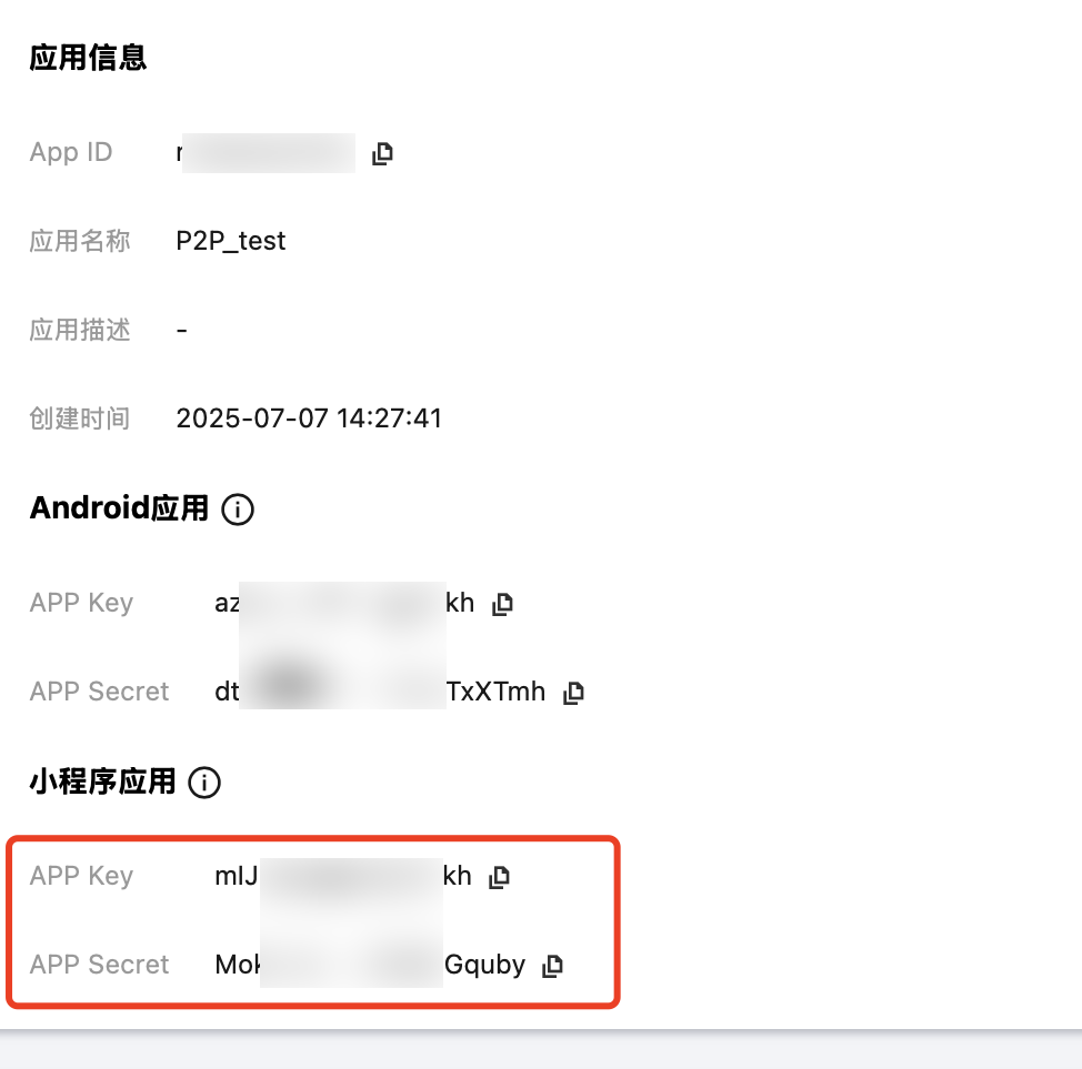 2. 在应用信息中,获取小程序的 APP Key 和 APP Secret。