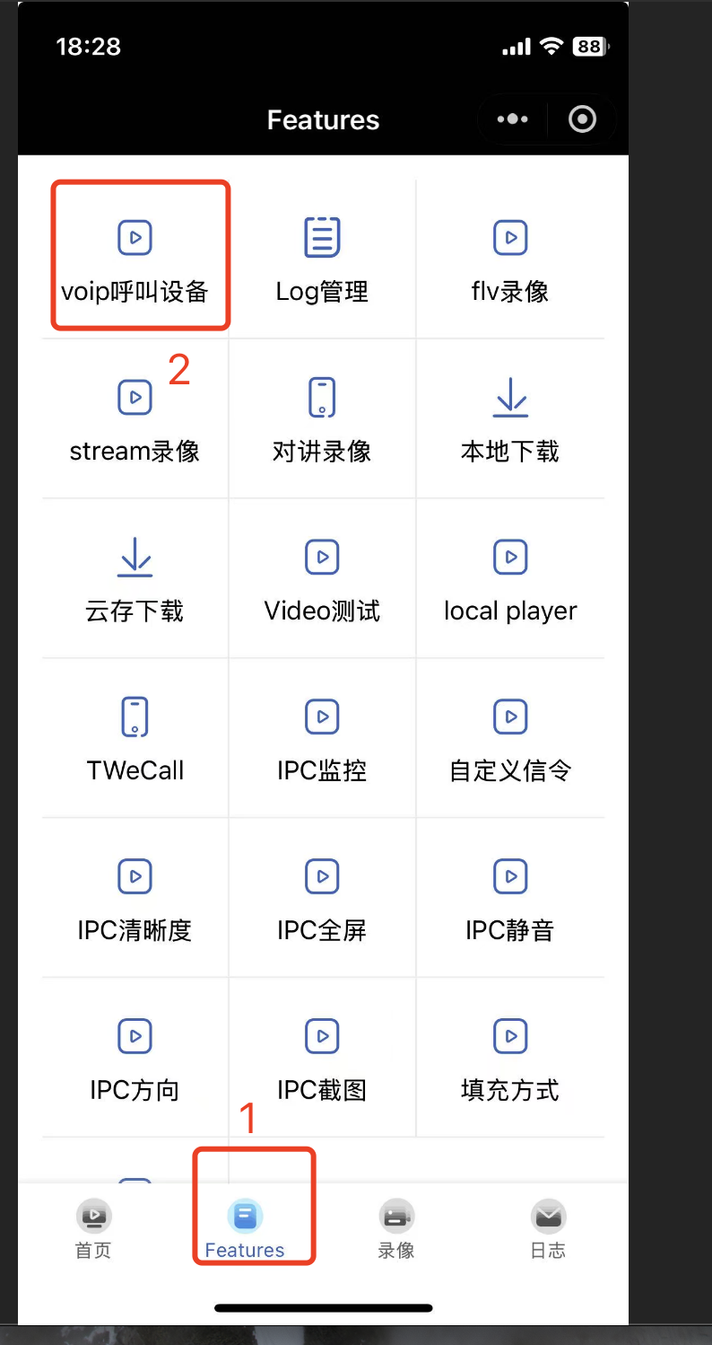 1. 回到体验小程序界面,选择 Features > voip呼叫设备。