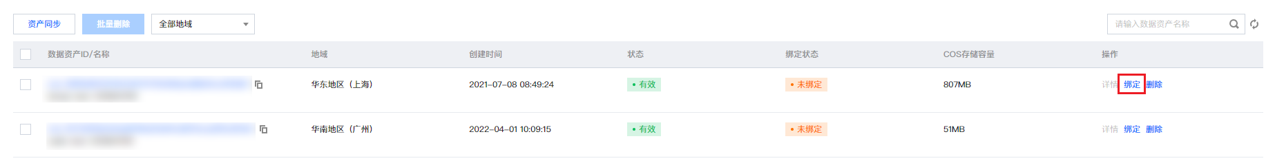 4. 在数据源列表,选择需要绑定的 COS 资产,单击操作栏中的绑定即可。