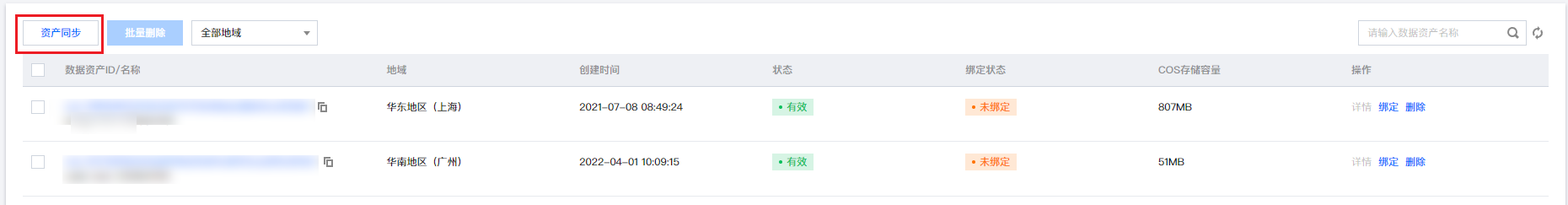 4. 在对象存储页面,单击资产同步,即可同步 COS 资产。
