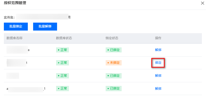 5. 在授权范围管理弹窗中,选择需要进行后续安全治理的数据库 DB,单击操作栏中的绑定即可。