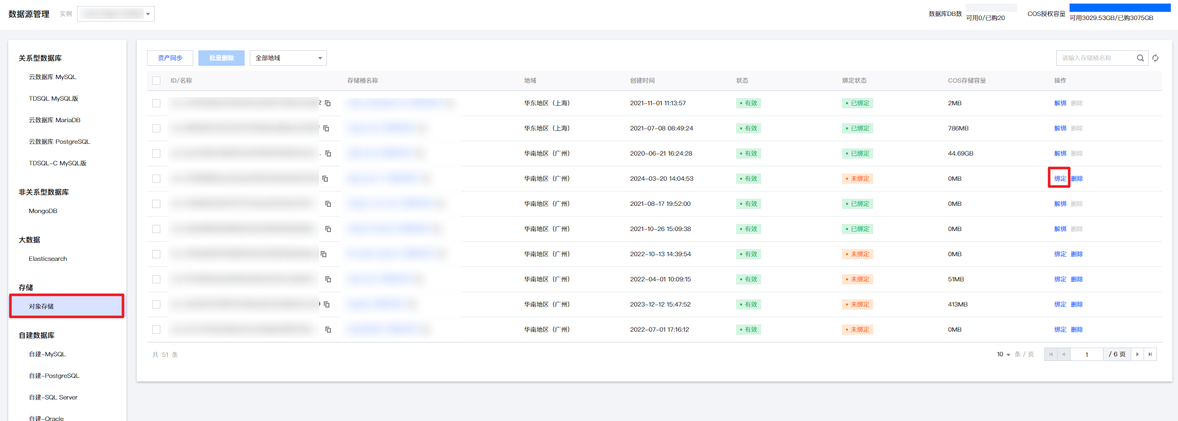4. 在数据源列表中,选择需要绑定的 COS 资产,单击操作栏中的绑定即可。