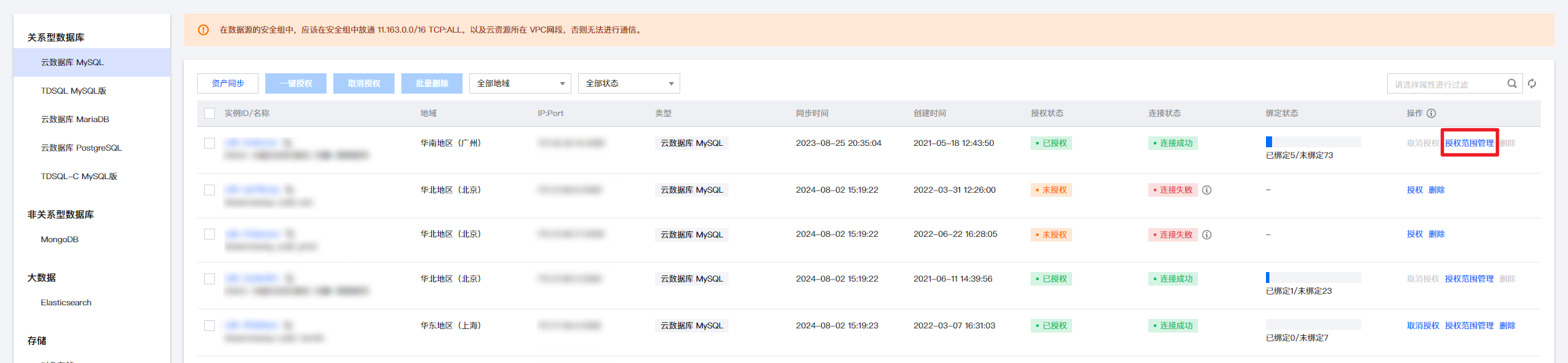 4. 在数据源列表中,选择需要绑定的数据库,单击操作栏中的授权范围管理。