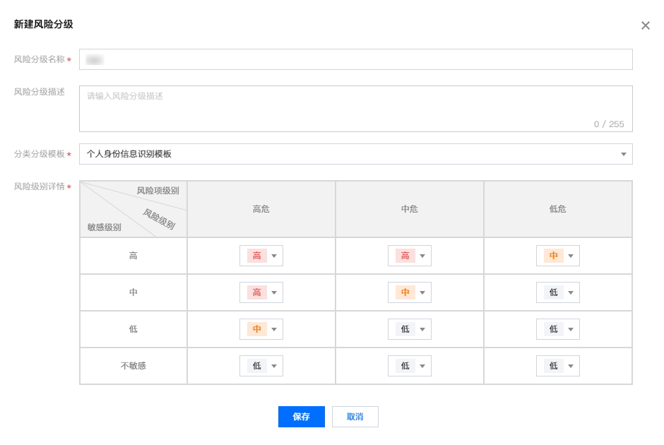 5. 在新建风险级别窗口,输入风险分级基本信息,选择需要关联的分类分级识别模板,单击保存。