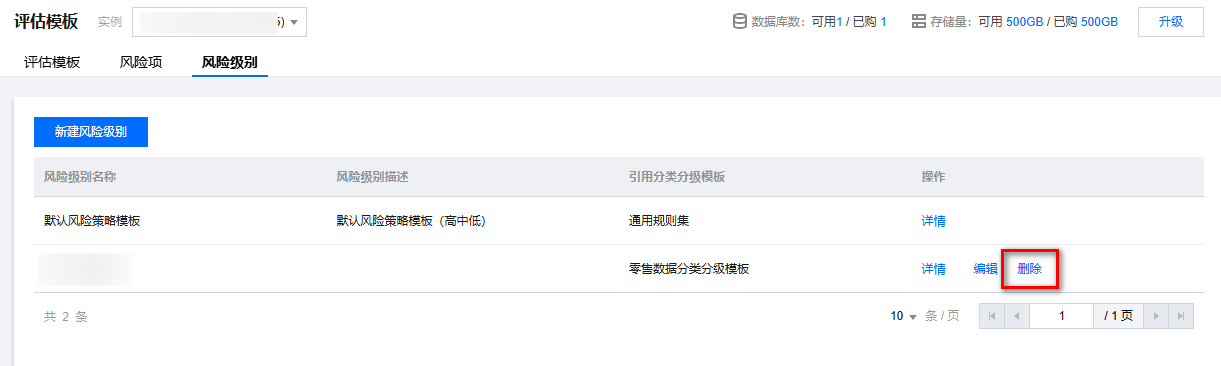 1. 在风险级别页面,选择需要删除的风险级别,单击操作栏中的删除。