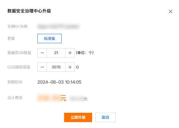 4. 在升级页面中,选择需要升级的套餐、数据库 DB 个数或存储容量,确认无误后单击立即升级,在付费后即可升级成功。