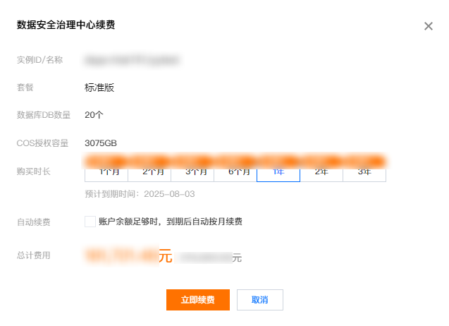 4. 在续费页面中,选择需要续费的时长,确认无误后单击立即续费,在付费后即可续费成功。