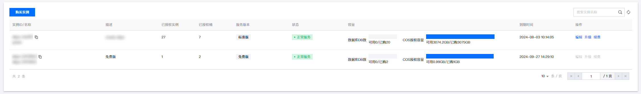 3. 在实例列表中,系统会显示您购买的实例的详细信息,包括实例版本、容量和到期时间等。