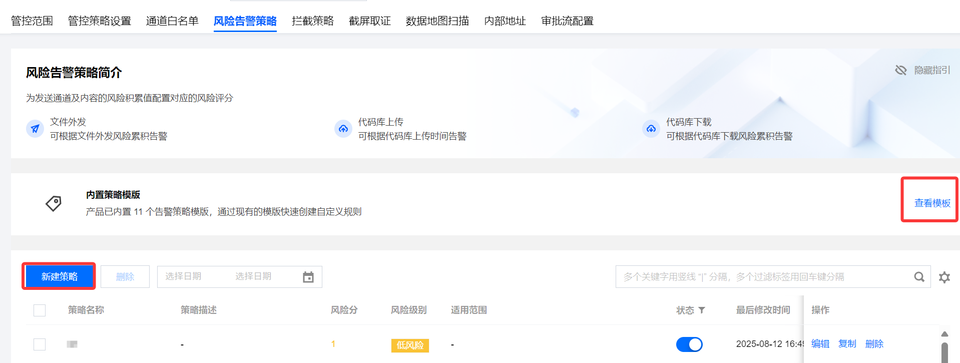 2. 在数据安全策略页面,选择风险告警策略,您可以在当前页面查看已有的风险告警策略。您可以单击查看模板,通过模板进行创建;也可以单击新建策略,直接新建自定义策略。