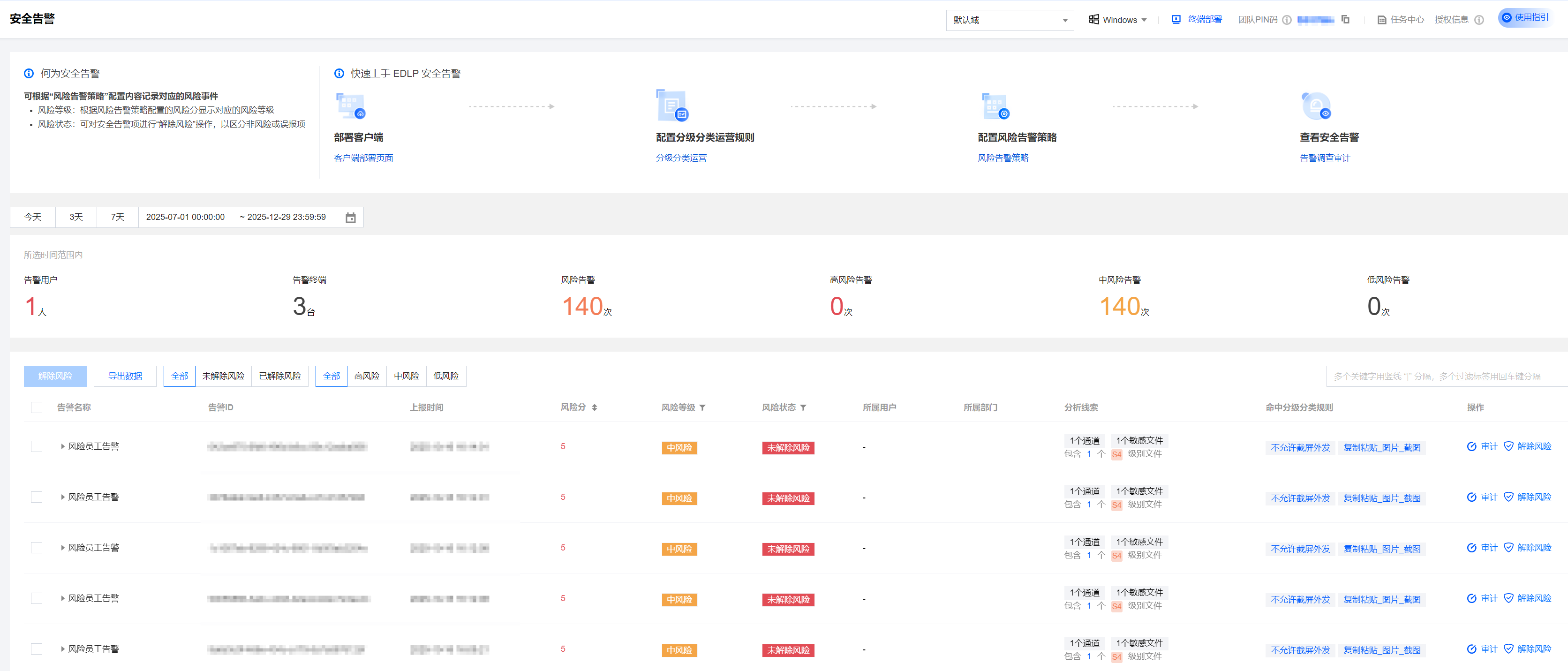 配置个性化告警策略,当管控对象触发其规则时,将上报 iOA 平台,帮助管理员实时监控和识别潜在数据泄露风险。产品内置多个告警策略模板,您可以通过现有的模板快速创建自定义规则。