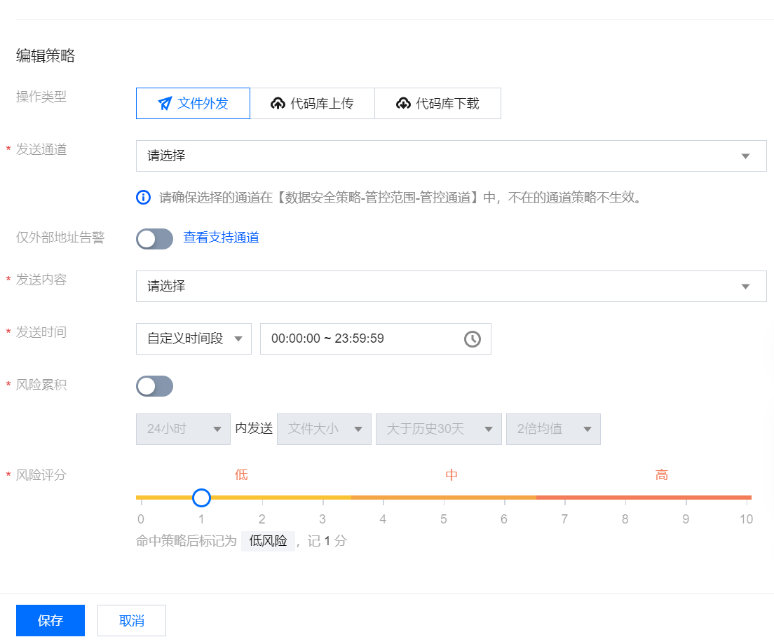 3. 场景示例:用户 A 通过文件传输工具外发数据库大文件时,触发风险告警策略产生告警。您应先在数据安全策略 > 管控范围中添加适用范围时添加用户 A,并在数据安全策略 > 管控范围> 管控通道中勾选文件传输工具。管控范围 配置完成后按如下文档配置风险告警策略。