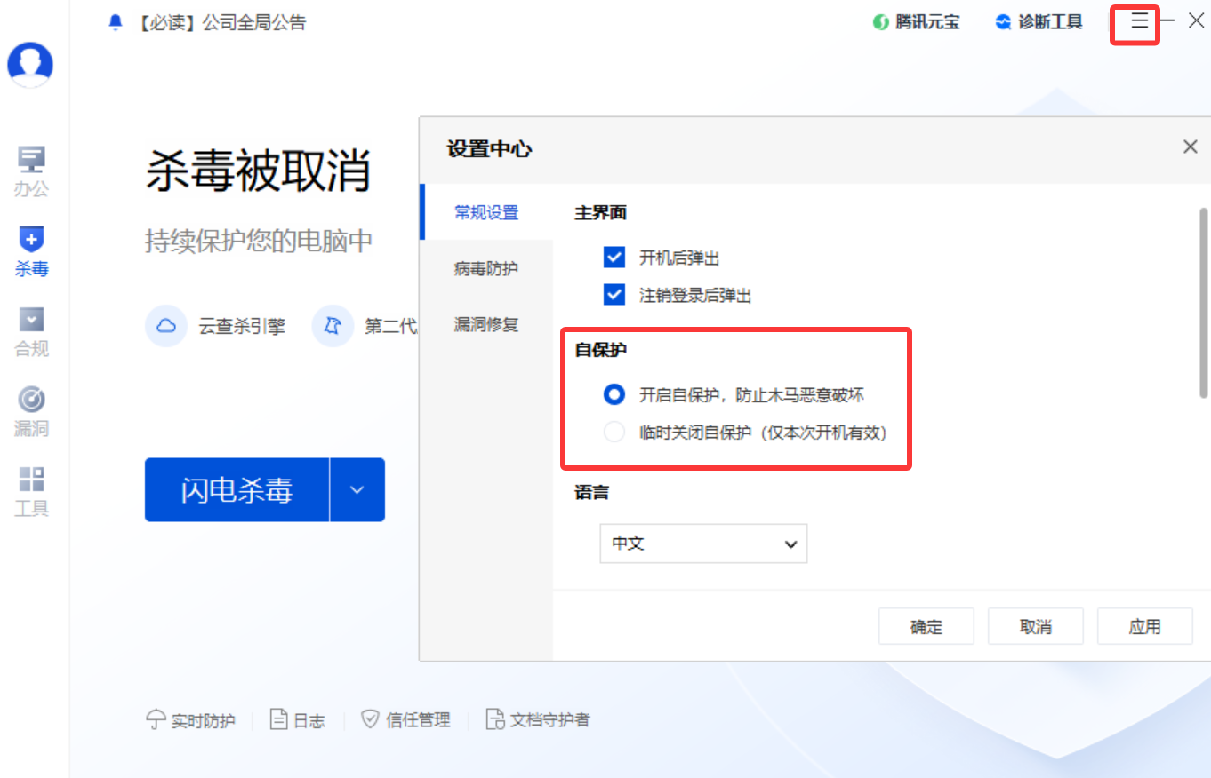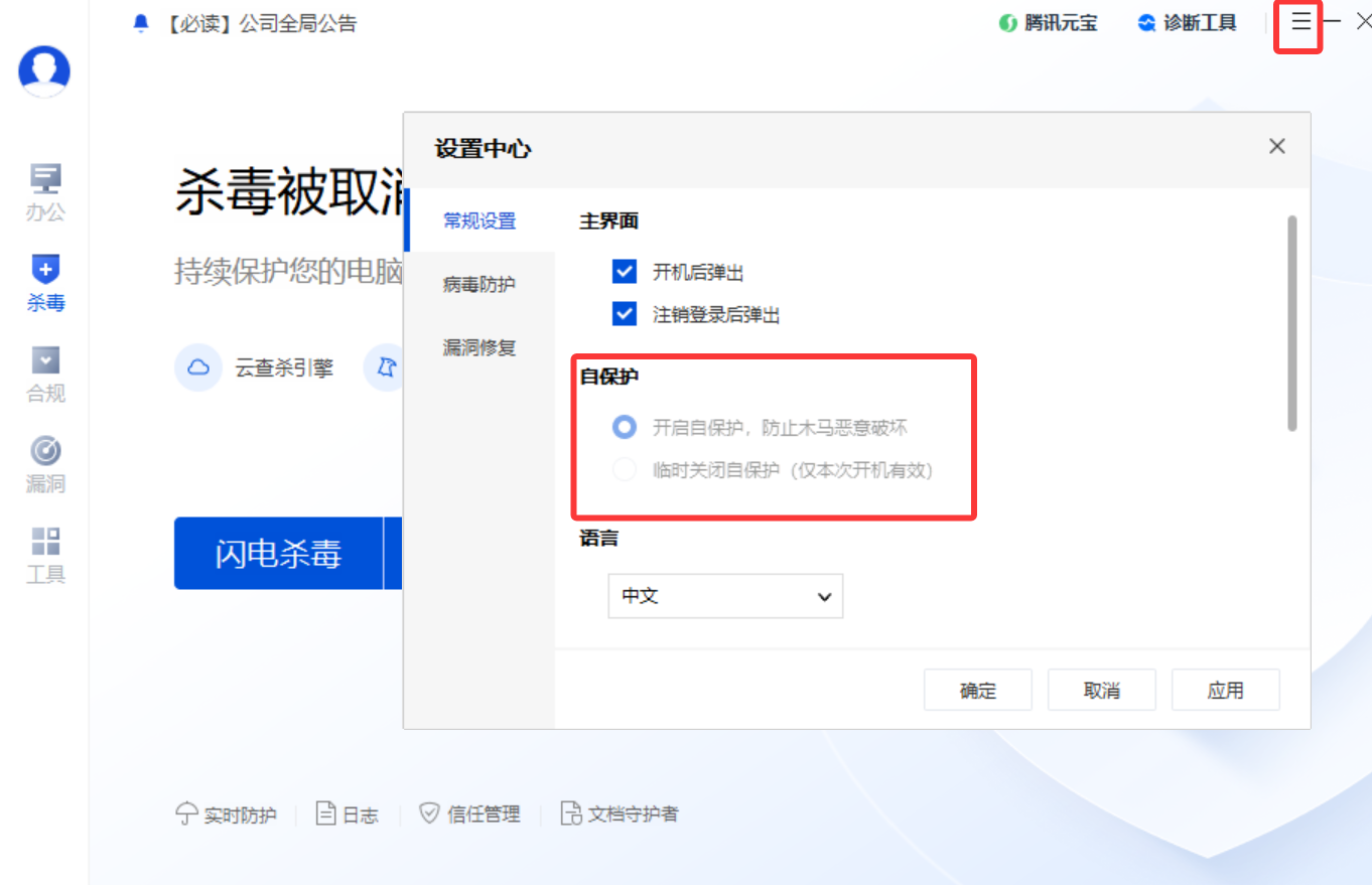 若勾选允许客户端修改设置:自保护设置以客户端设置为准,用户在客户端可手动修改是否开启/临时关闭自保护。
