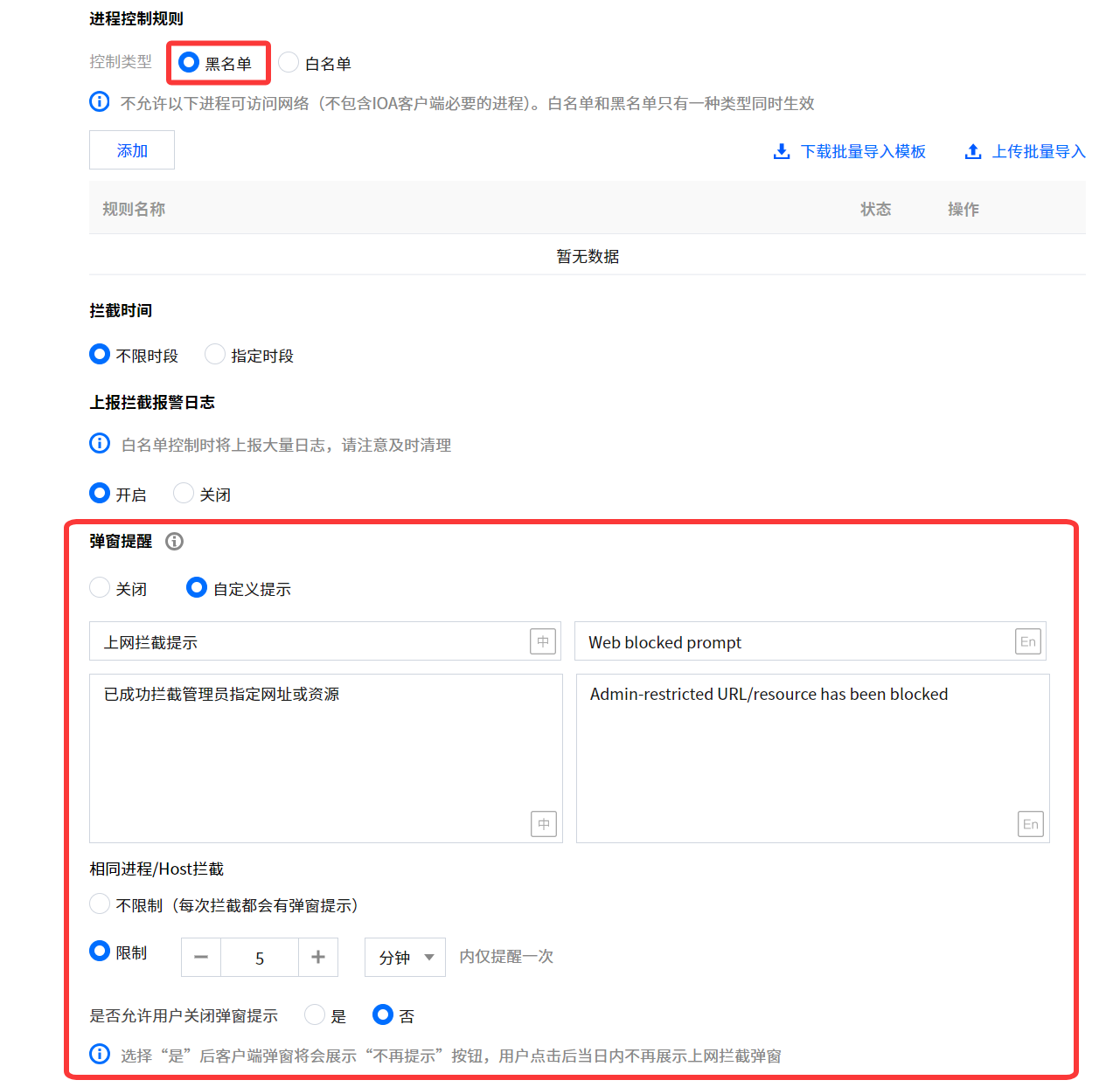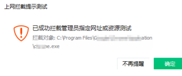 4. 弹窗提醒:在进程控制规则设置为“黑名单”时,系统支持自定义弹窗内容。弹窗样式可参考“上网拦截弹窗提醒”。