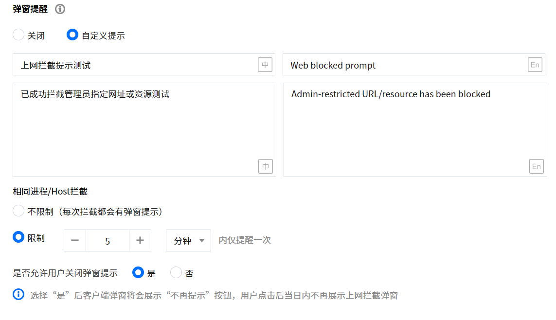 1. 支持自定义上网拦截提示内容弹窗。