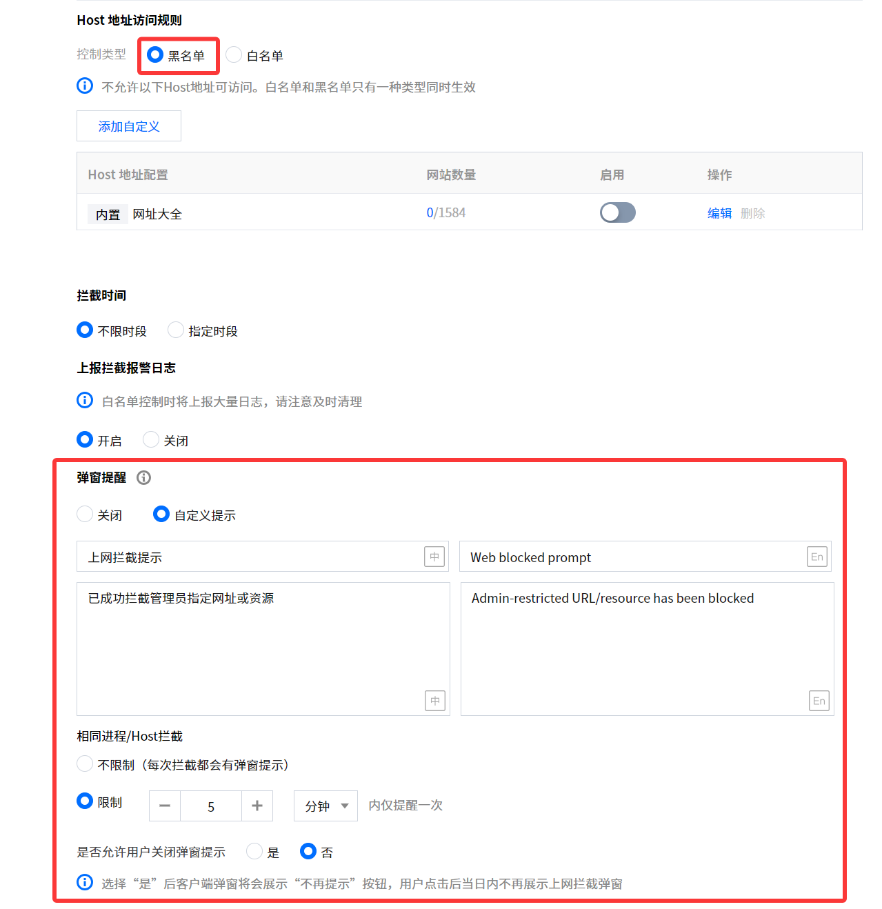 4. 弹窗提醒:在 Host 地址访问规则设置为“黑名单”时,系统支持自定义弹窗内容。弹窗样式可参考“上网拦截弹窗提醒”。