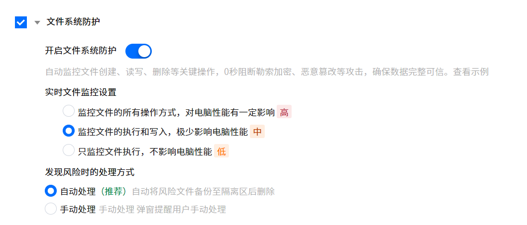 2. 发现风险时的处理方式:推荐自动处理,自动将风险文件备份至隔离区后删除。