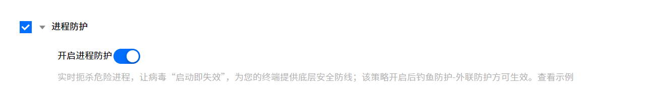 2. 勾选进程防护并开启进程防护开关后,规则运营 > 实时防护 > 钓鱼防护 > 外联防护方可生效。