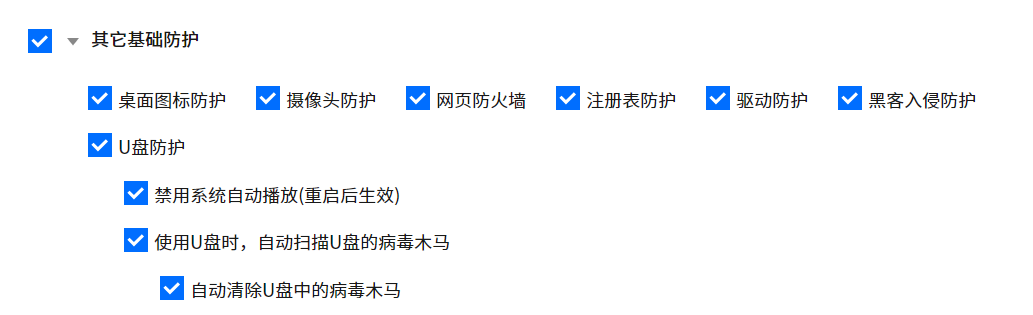 1. 在实时防护 > 其他基础防护中,启用各项防护功能:包括桌面图标防护、摄像头防护、网页防火墙、注册表防护、驱动防护、黑客入侵防护、U盘防护。