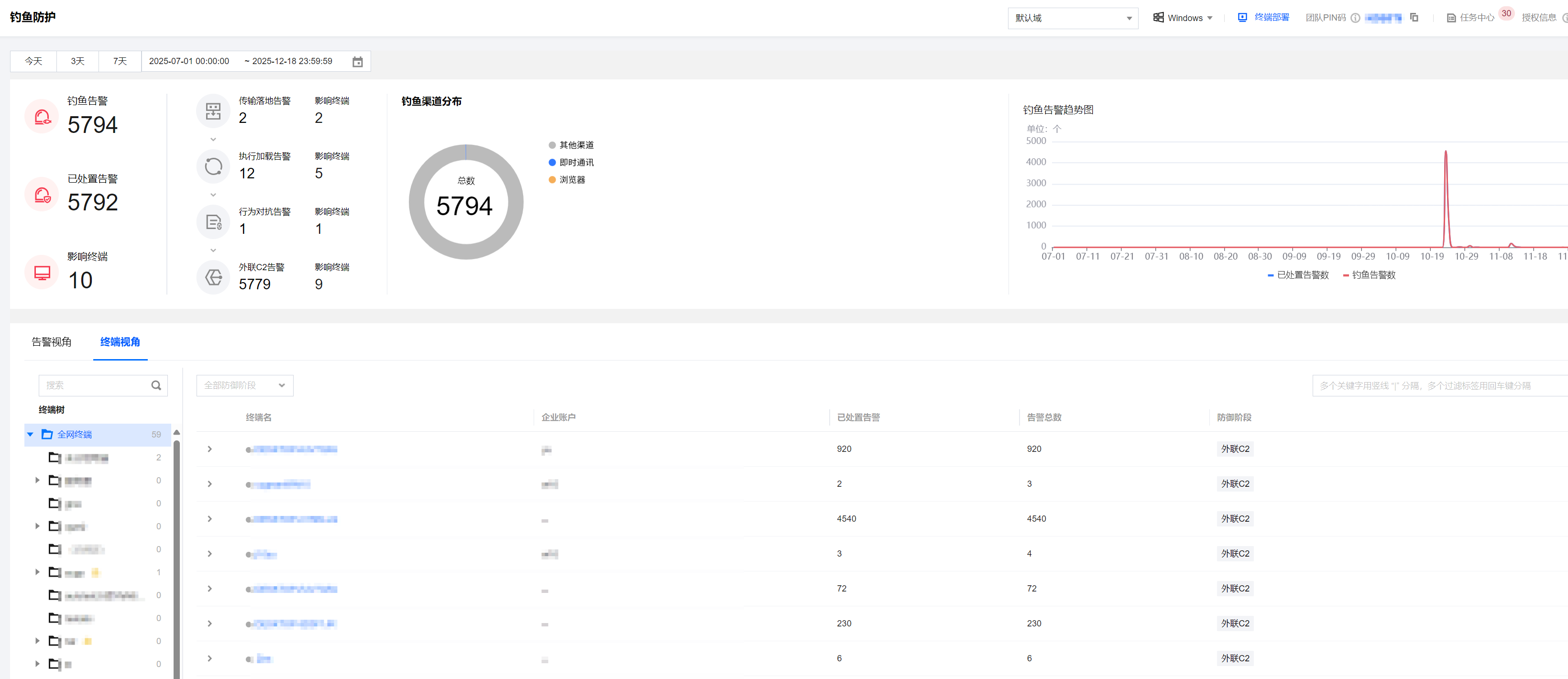 2. 查看钓鱼告警:在终端安全防护中心 > 安全态势 > 钓鱼防护中即可查看终端钓鱼防护相关告警。