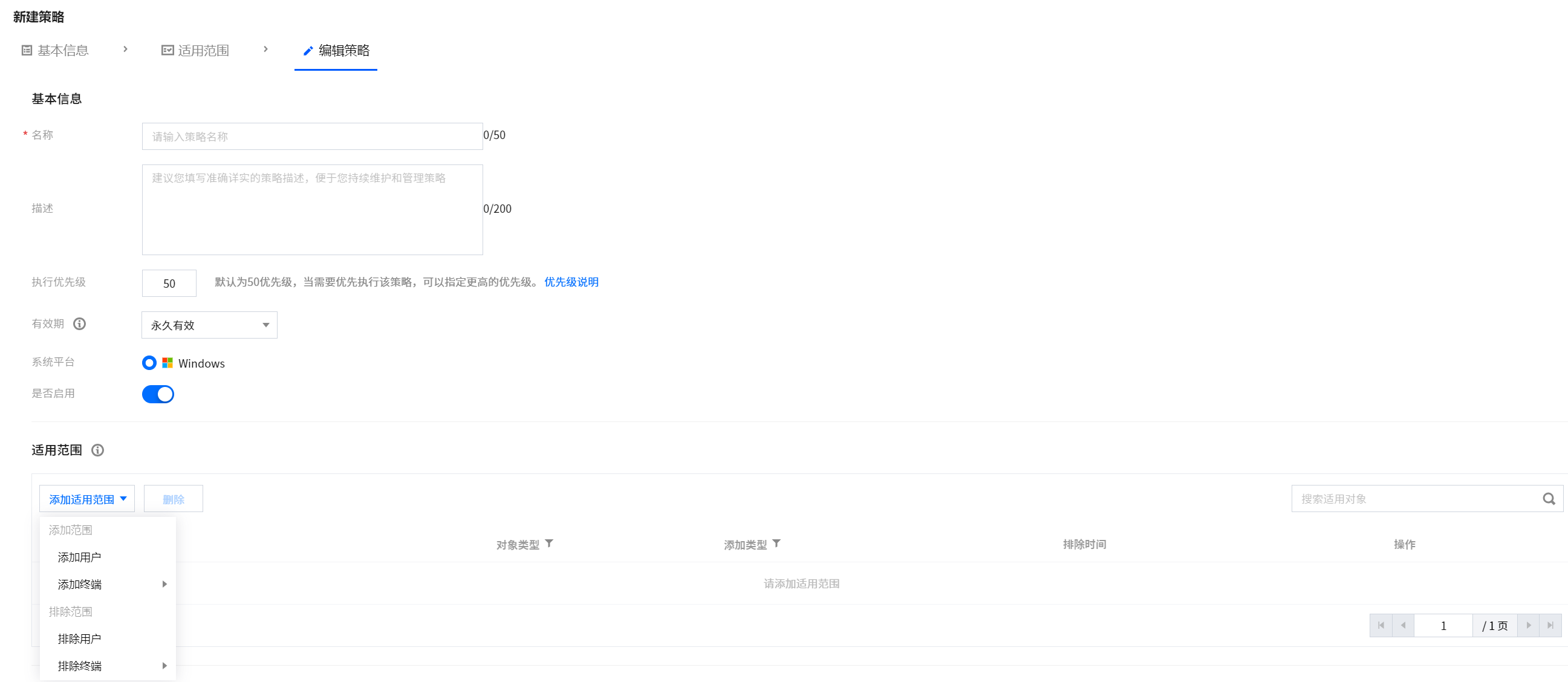 3.2 单击添加适用范围 ,勾选需管控/排除的用户/终端名称,单击确定。