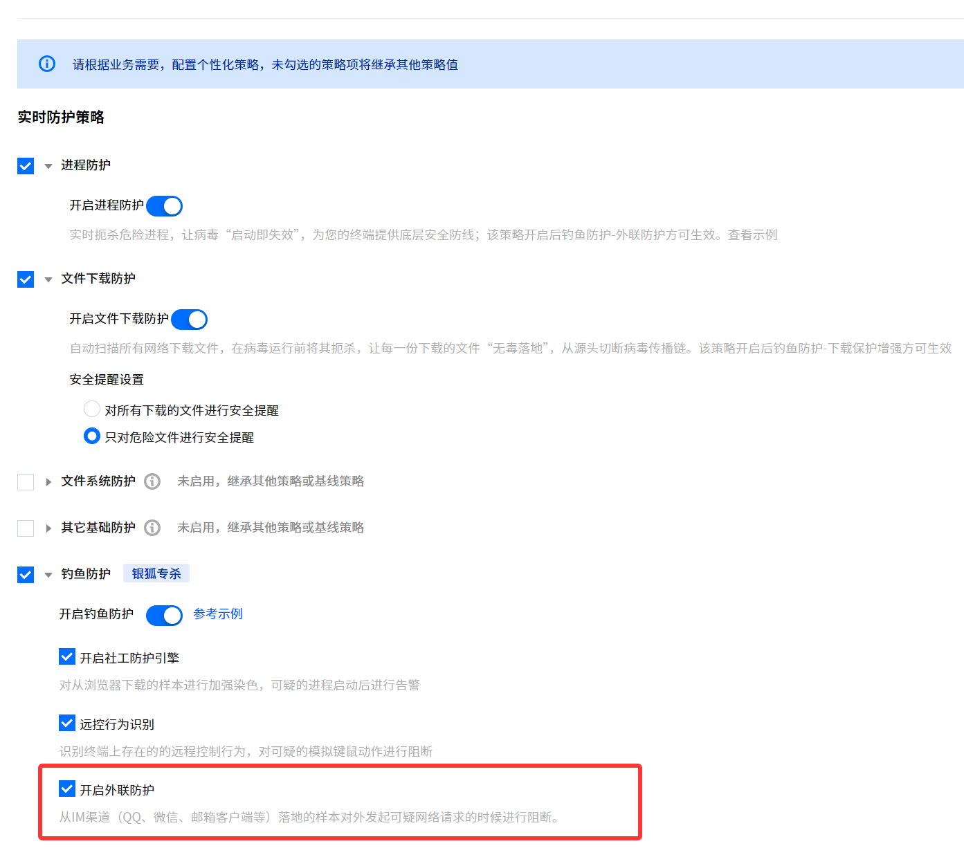 开启外联防护:从IM 渠道(QQ、微信、邮箱客户端等)落地的样本对外发起可疑网络请求的时候进行阻断。