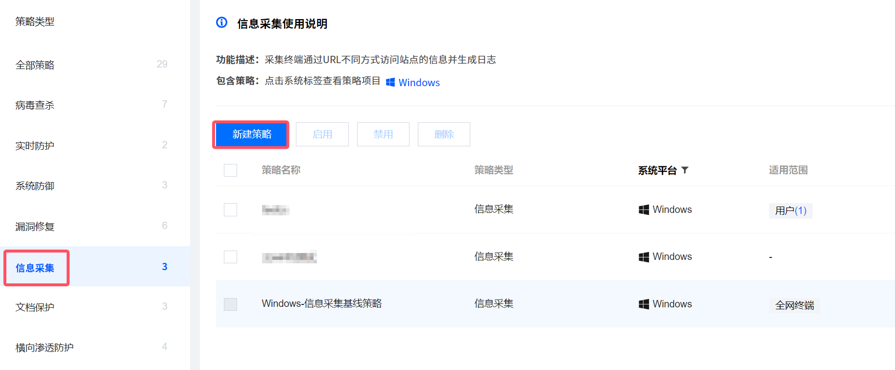 2. 在规则运营页面,选择信息采集,单击新建策略。