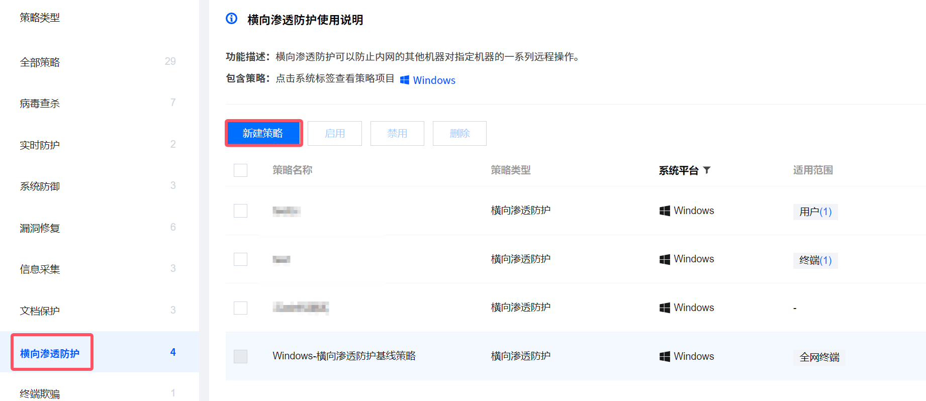 2. 在规则运营页面,选择横向渗透防护,单击新建策略。