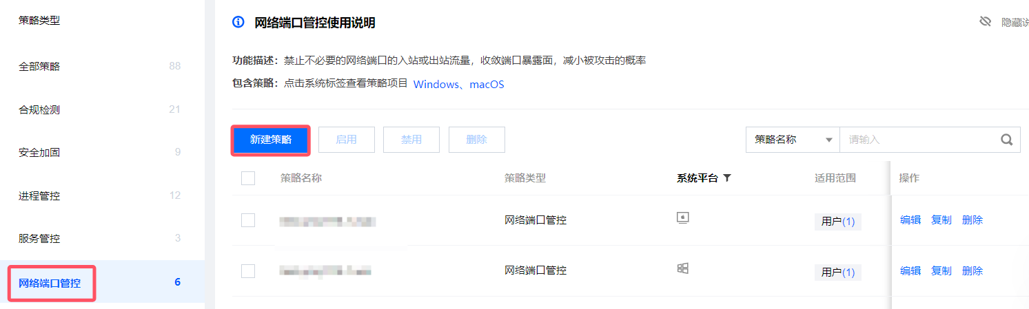 2. 在终端管控页面,选择网络端口管控,单击新建策略。
