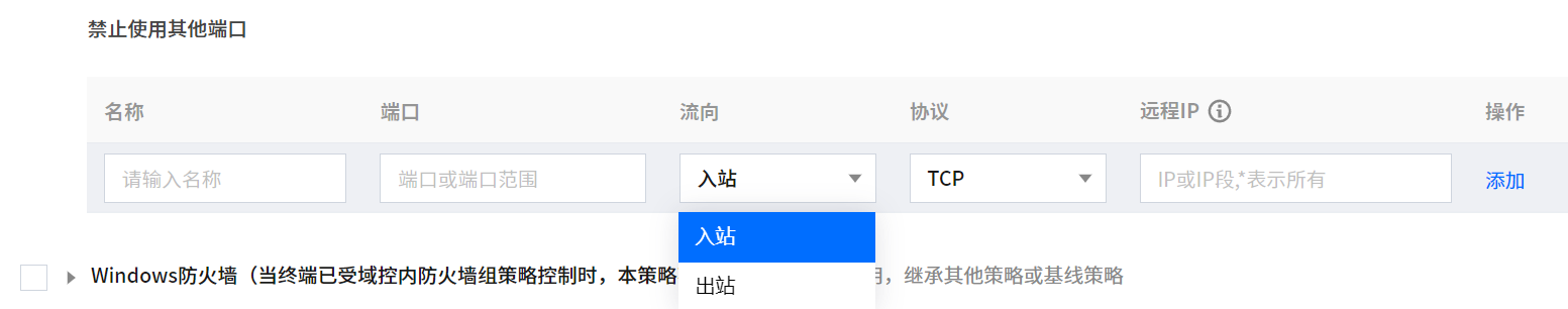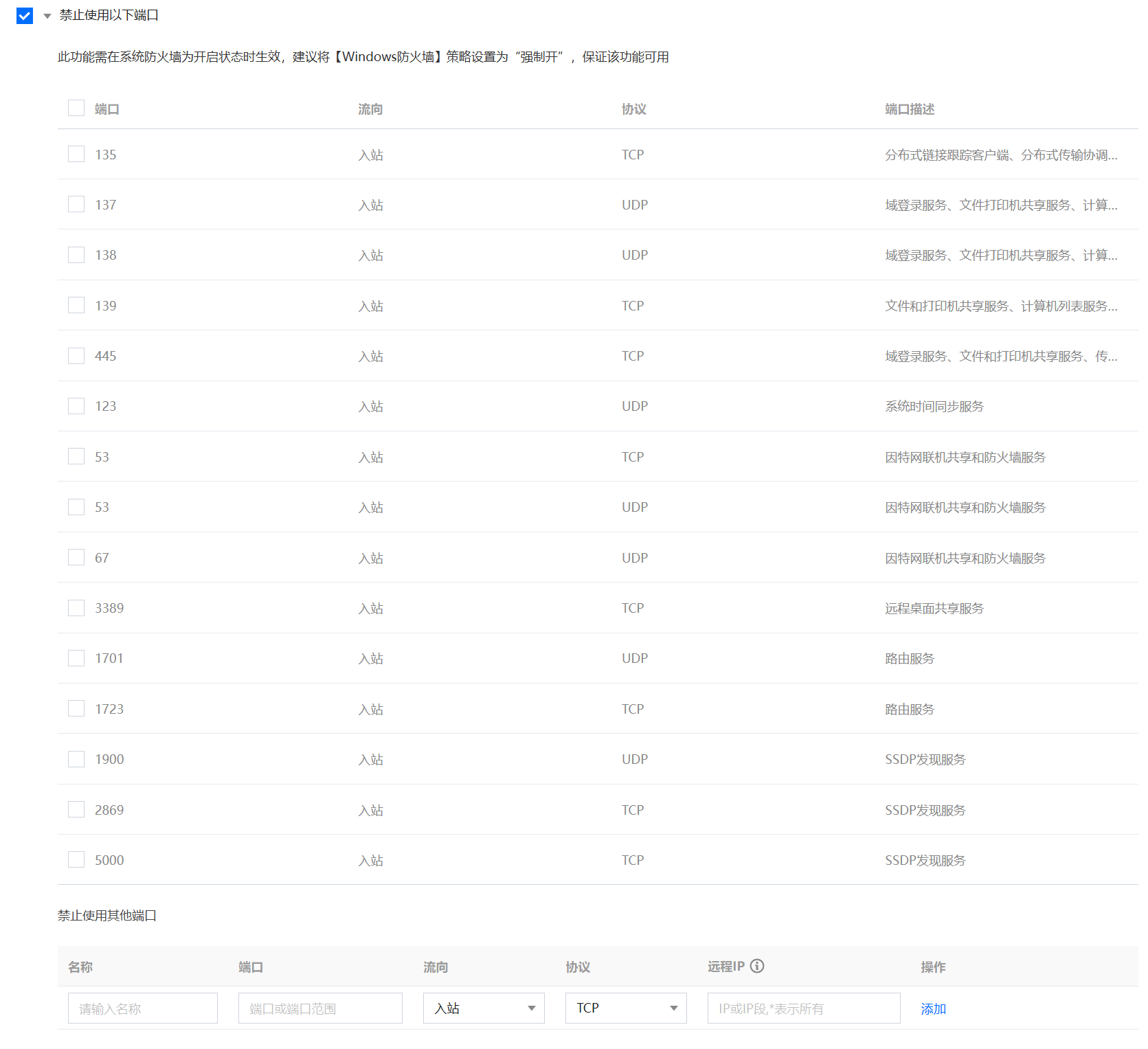 2. 支持自定义配置禁止使用其他端口,用于禁止 iOA 终端上网络端口的入站或出站流量,禁用一些特殊网络服务。