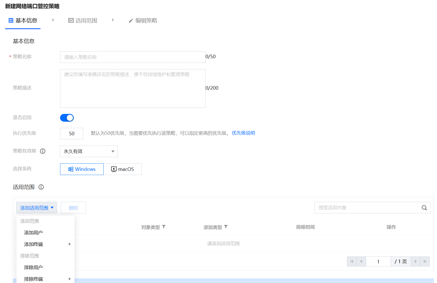 3. 在新建网络端口管控策略页面,配置相关参数。