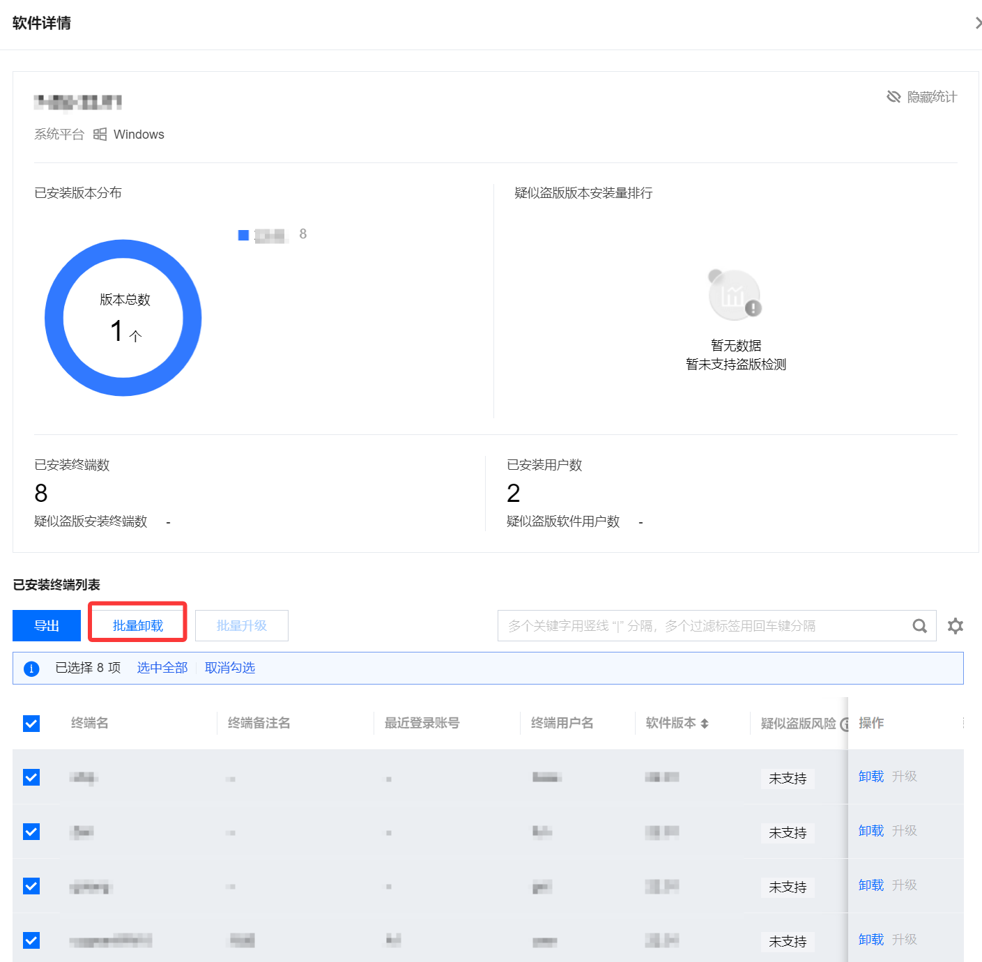 4. 开启检测后,系统将定期(约每 4 小时一次)进行盗版检测,可在 软件清单页面 查看软件的盗版检测情况。