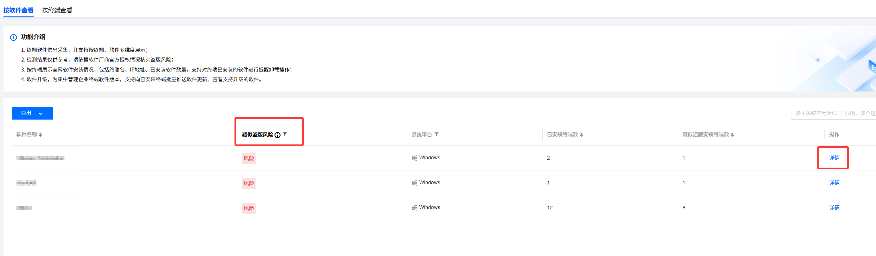 5. 在软件清单页面,单击盗版风险,可快速筛选软件盗版情况。