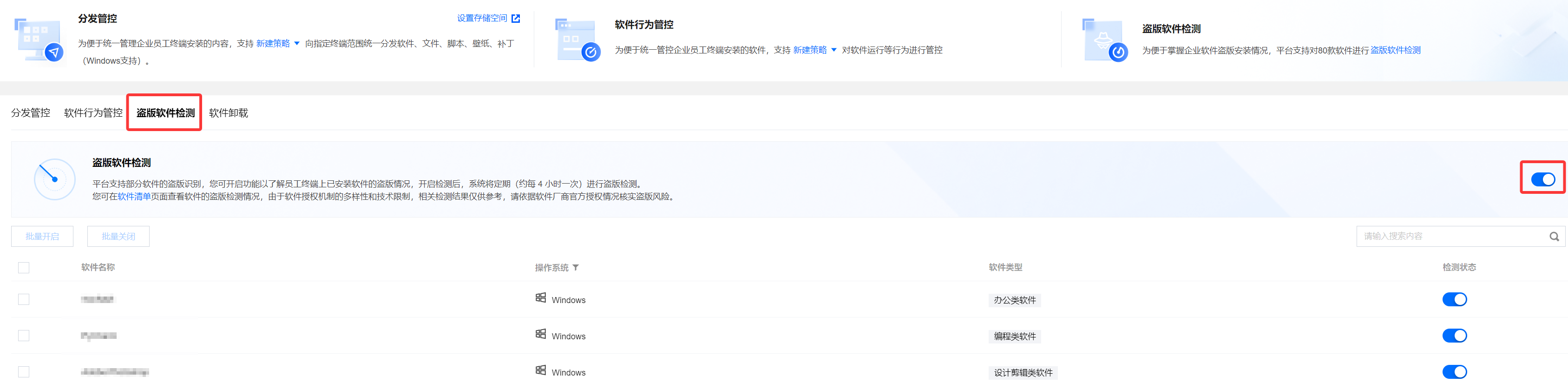 3. 勾选需开启检测的软件名称(支持批量勾选),勾选后单击批量开启。