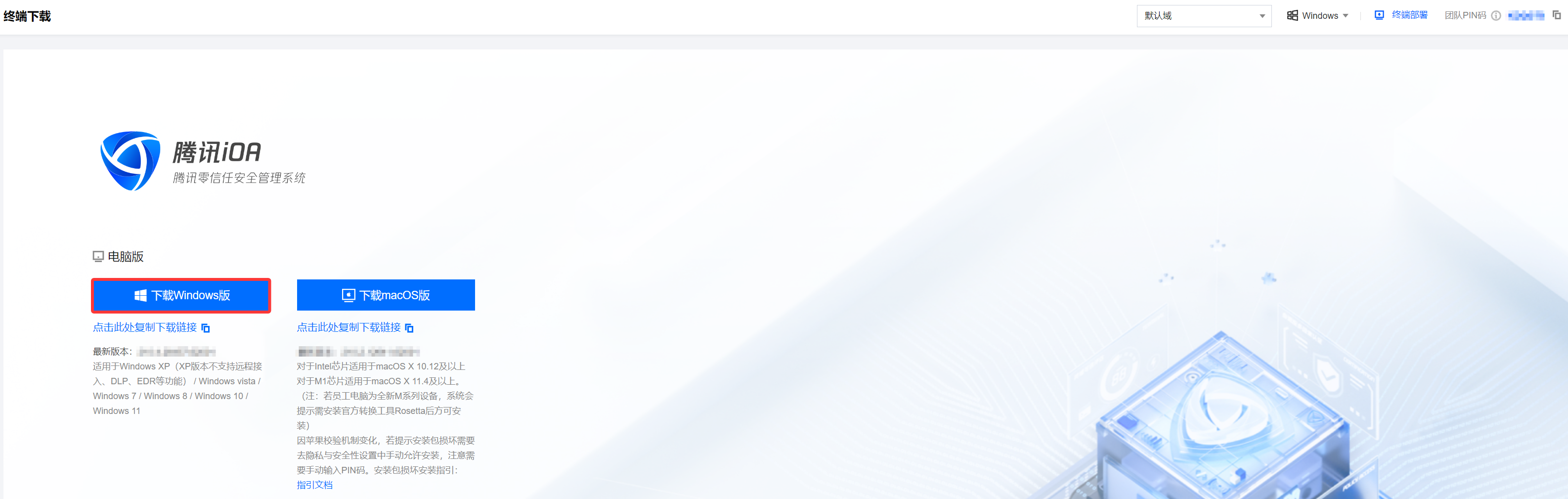 1. 登录 iOA 零信任管理平台控制台,单击终端部署,下载 Windows 版安装包(安装包为 exe 格式)并将安装包提供给 iOA 技术支持。