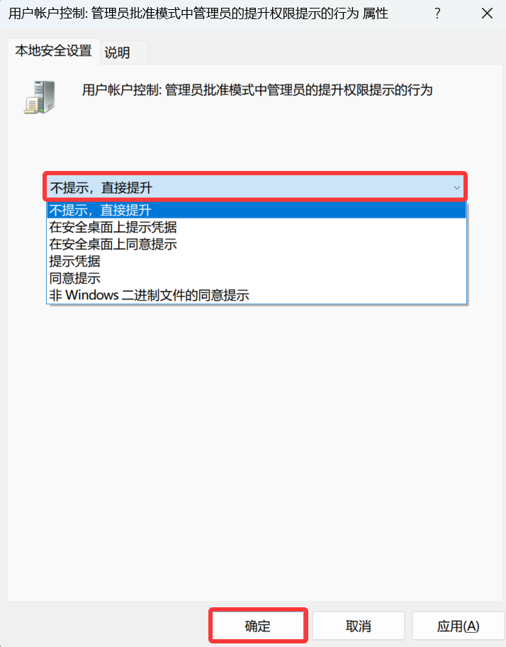 3. 双击打开“用户账户控制:管理员批准模式中管理员的提升权限提示的行为”,将其设置为“不提示,直接提升”,单击确定即可。
