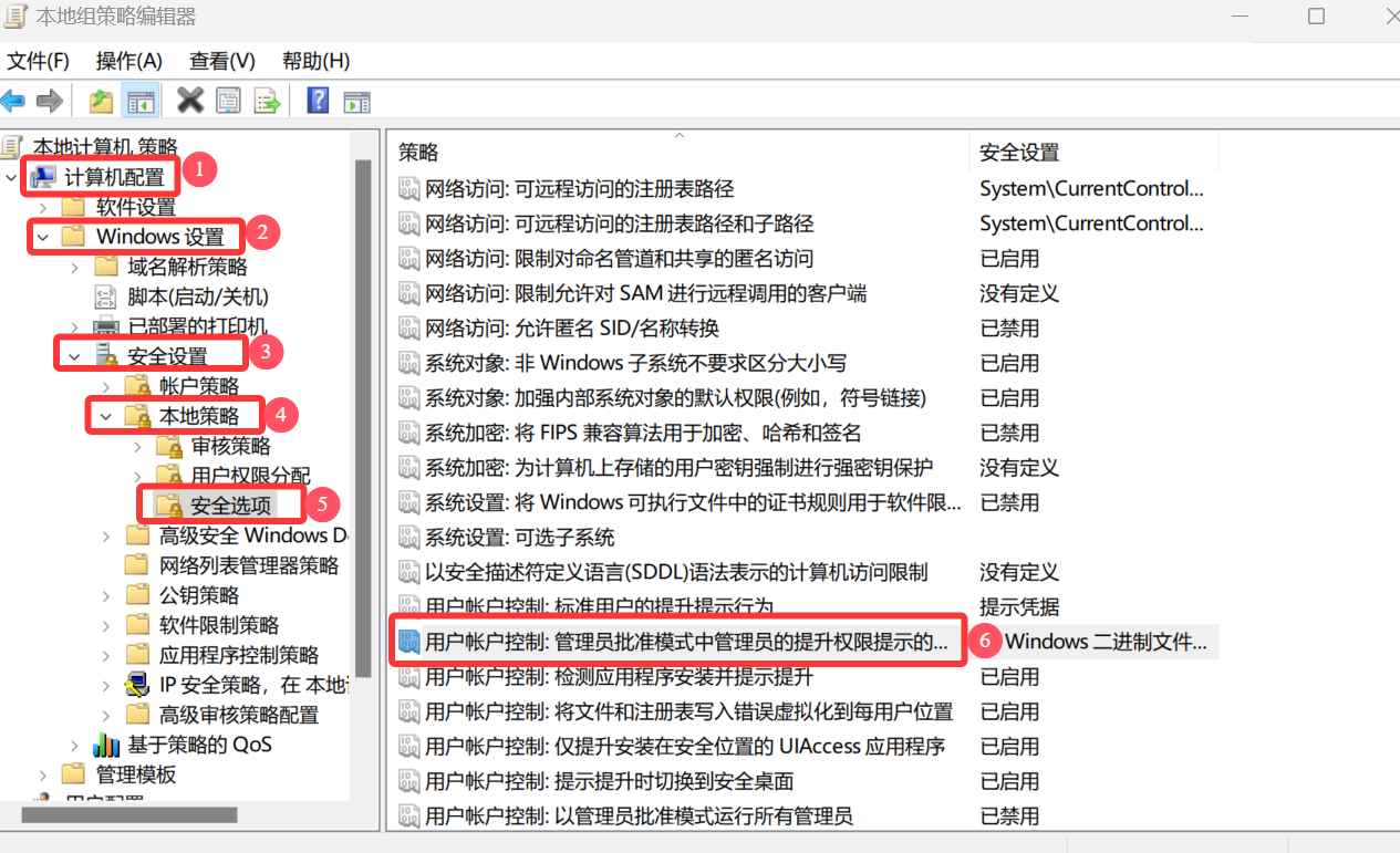 2. 在打开的窗口中,依次展开到“计算机配置 > Windows设置 > 安全设置 > 本地策略 > 安全选项”,在右侧找到“用户账户控制:管理员批准模式中管理员的提升权限提示的行为”。