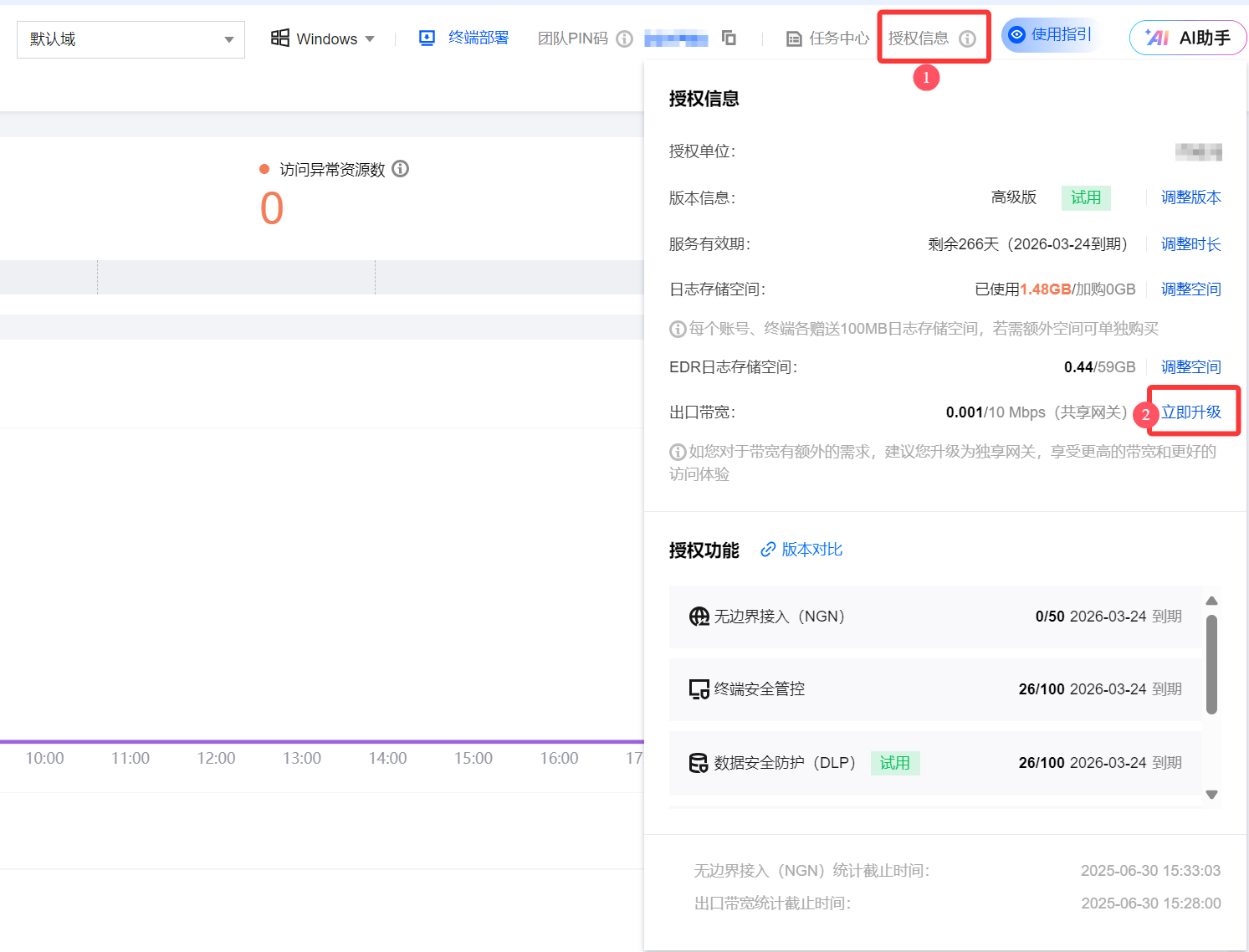 1. 登录 iOA 零信任管理平台控制台,在控制台右上角单击授权信息,在出口带宽处单击立即升级。