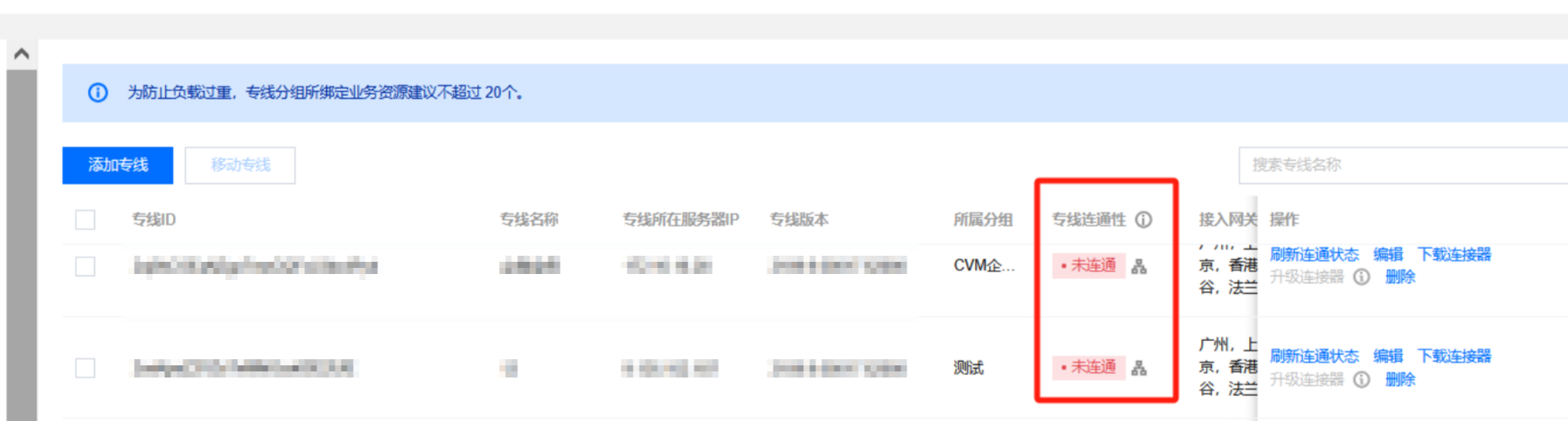 3. 购买完成,登录 iOA 零信任管理平台控制台 > 专线管理页,所有连接器会显示未连通,因为升配独享带宽后会重新分配连接地址,客户连接器安全组没有放通新网关的 IP 导致连接建立失败。