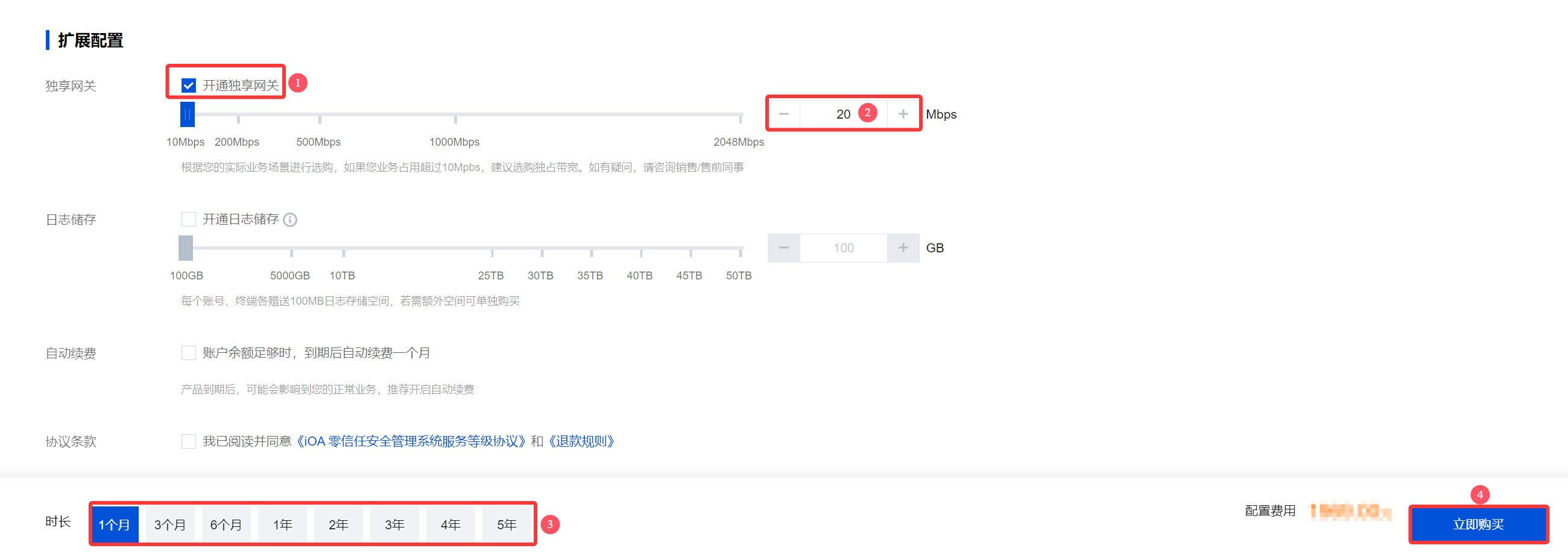 2. 进入iOA-SaaS 购买页面,下拉至扩展配置,勾选开通独享网关,填写需要升级多少带宽数量,选择对应购买时长,单击立即购买。