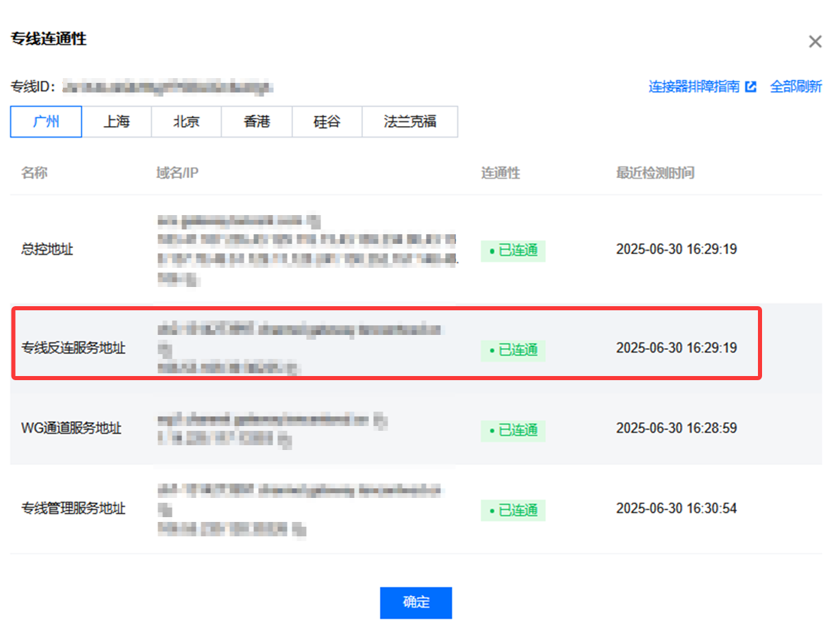 5. 客户侧的安全组策略放通反连地址后,连通性变为已连通,专线连通后即可正常访问业务资源。