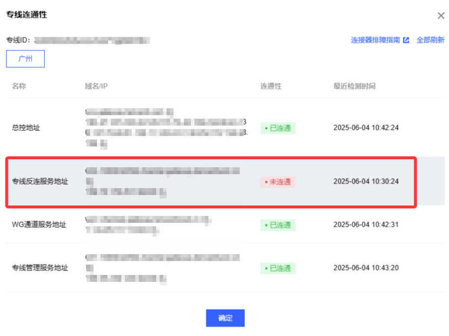 4. 将鼠标放置未连通上,查看详细异常地址,因反连地址和端口重新分配了,所以需要连接器网络安全组放开专线反连服务地址。