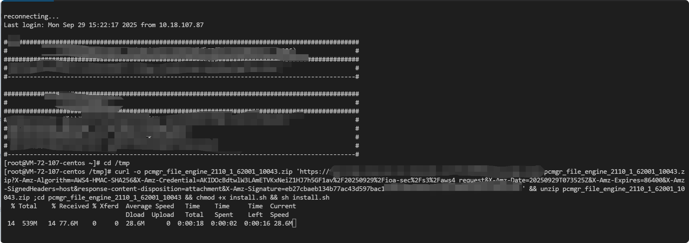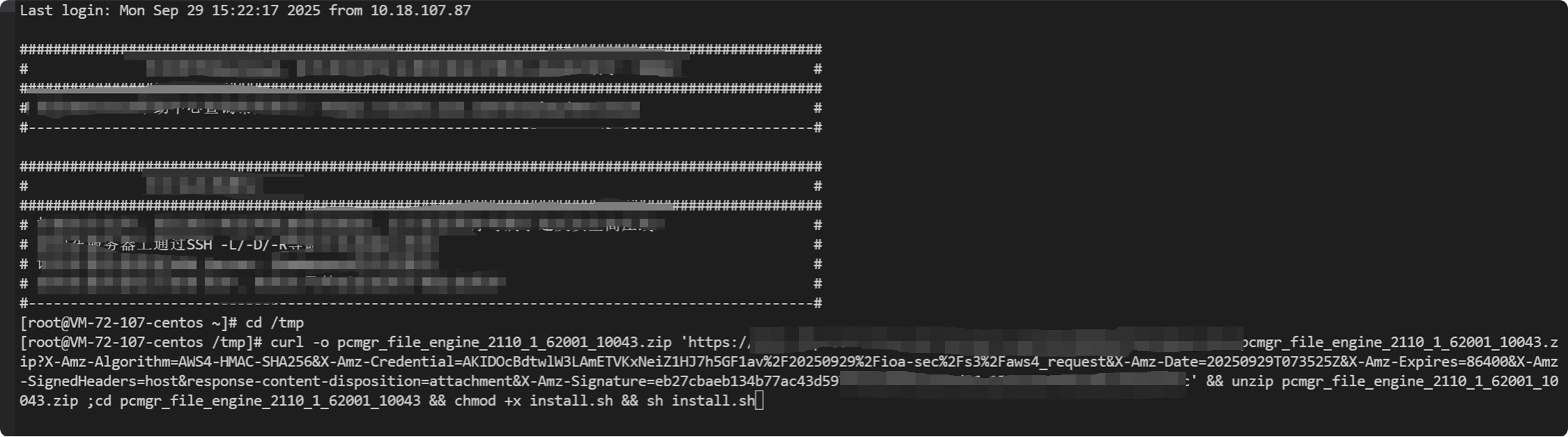 4. 复制命令至服务器,然后按 Enter 键执行命令。