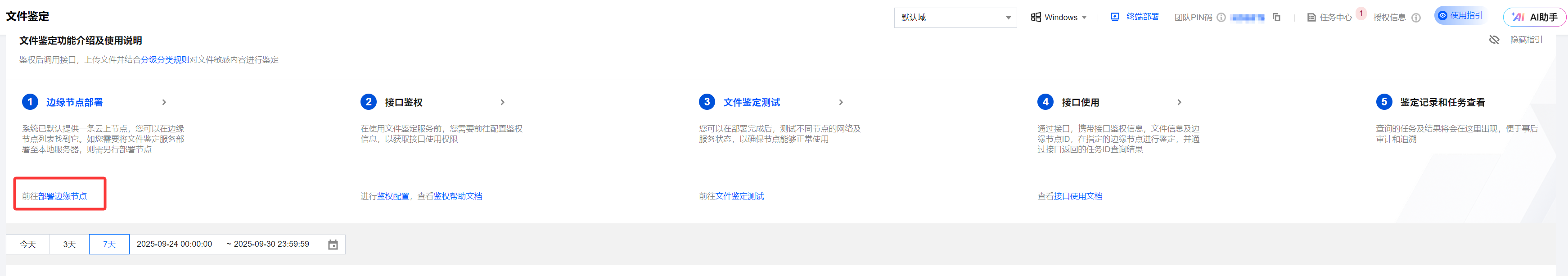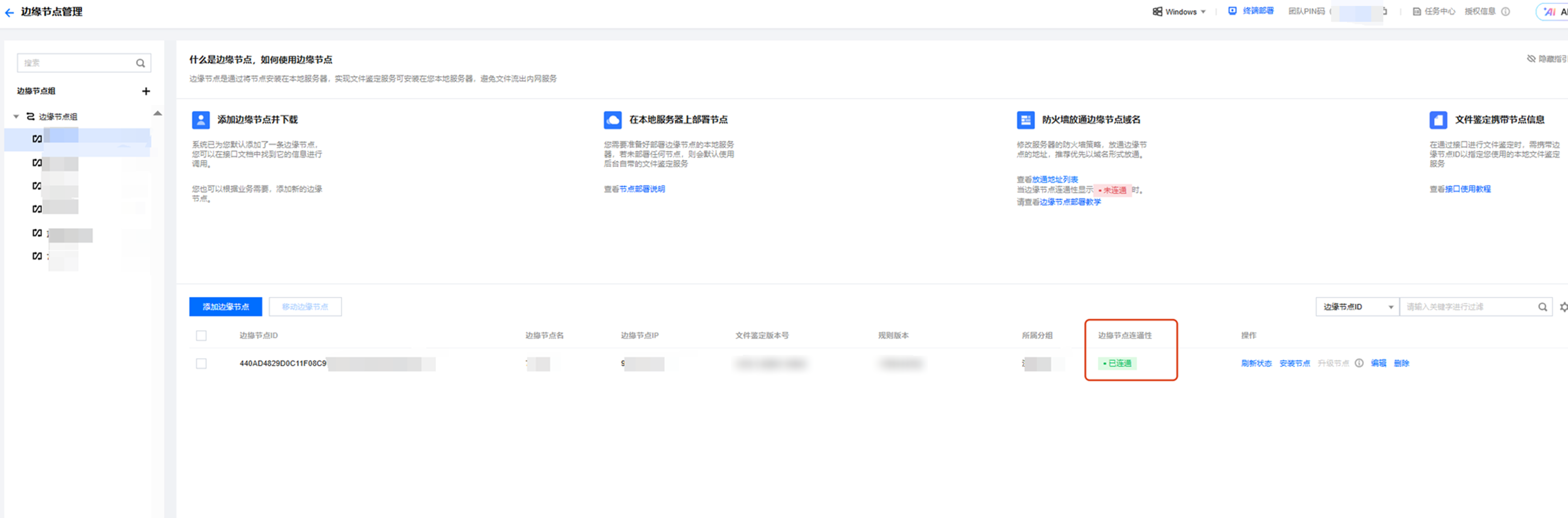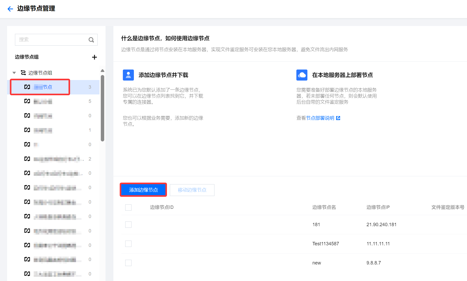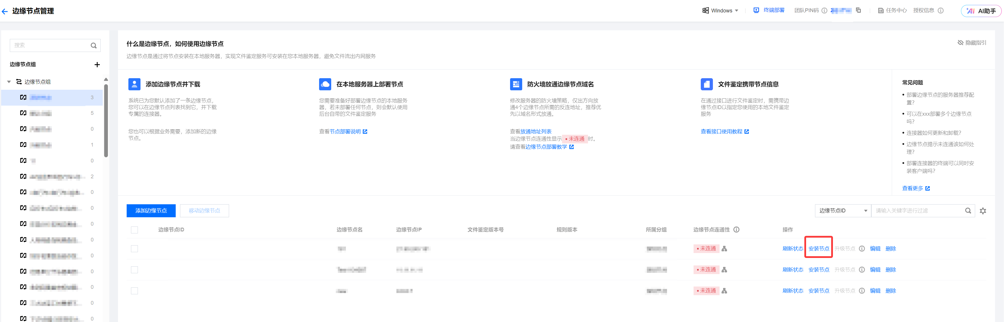 2. 在文件鉴定页面,单击部署边缘节点。在创建的节点中选择目标节点,单击安装节点。