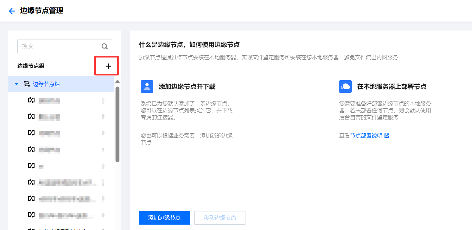 3. 在边缘节点管理页面,单击边缘节点组右侧的+ 。