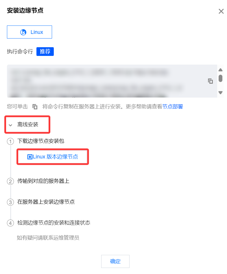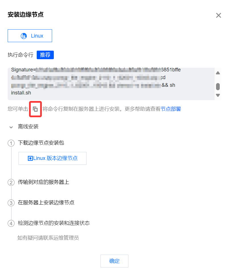 7. 在创建的节点中,单击安装节点,支持将命令行复制到服务器上进行在线安装与离线安装。