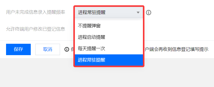 7. 配置完成单击保存,保存后信息会下发至客户端,客户端弹窗提醒用户完善登记信息,单击立即填写。