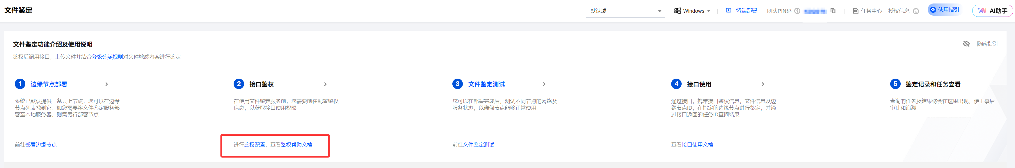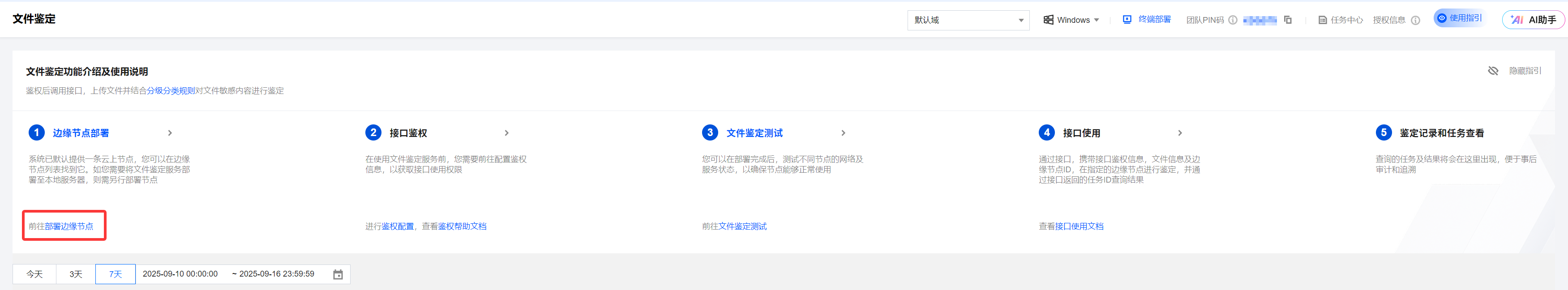 2. 在文件鉴定页面,单击部署边缘节点,即可在企业内部部署边缘节点(私有化文件鉴定服务),确保数据不出本地网络。详情请参见 部署边缘节点。