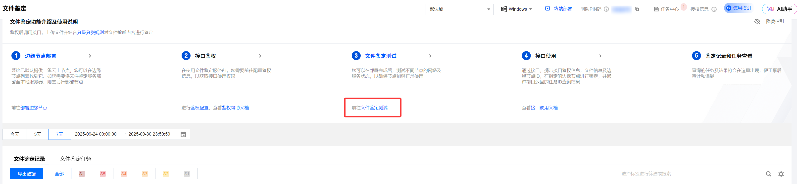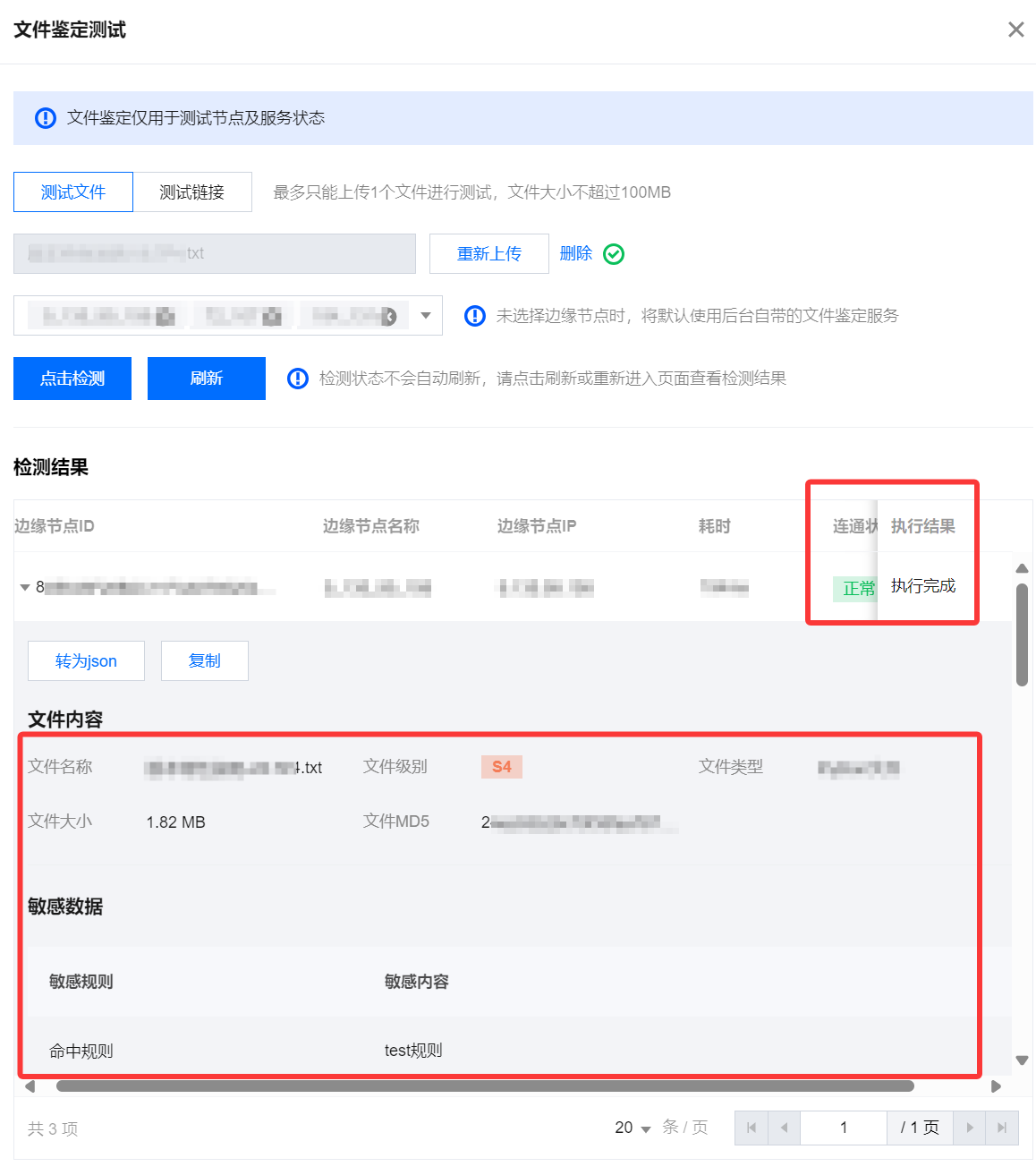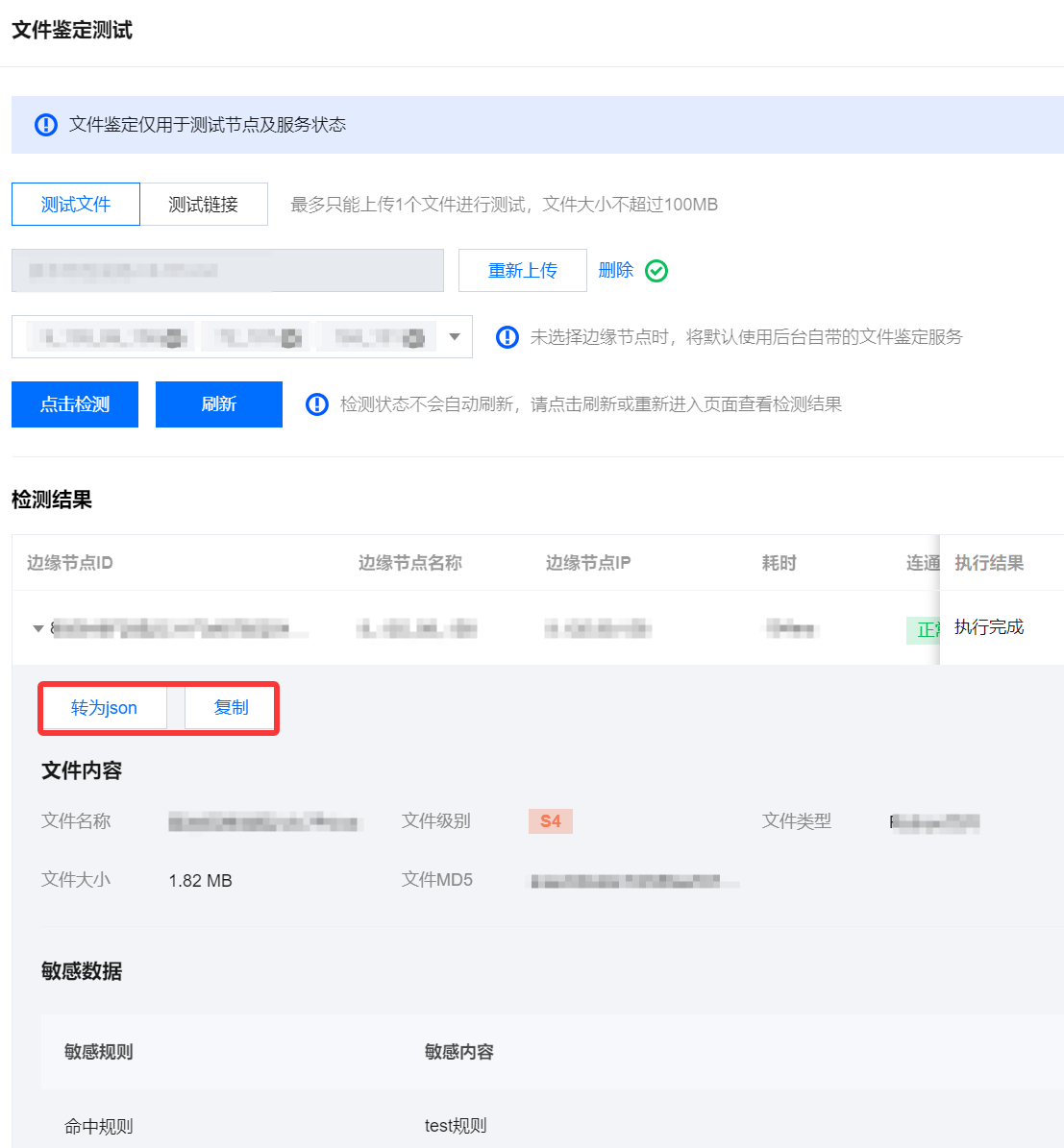 2. 在文件鉴定页面,单击文件鉴定测试,在边缘节点部署完成后,测试不同节点的网络及服务状态,以确保节点能够正常使用。
