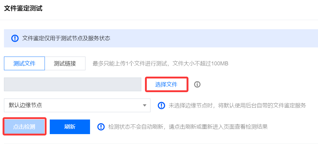 3. 在文件鉴定测试页面,可上传文件或链接以测试节点及服务状态。