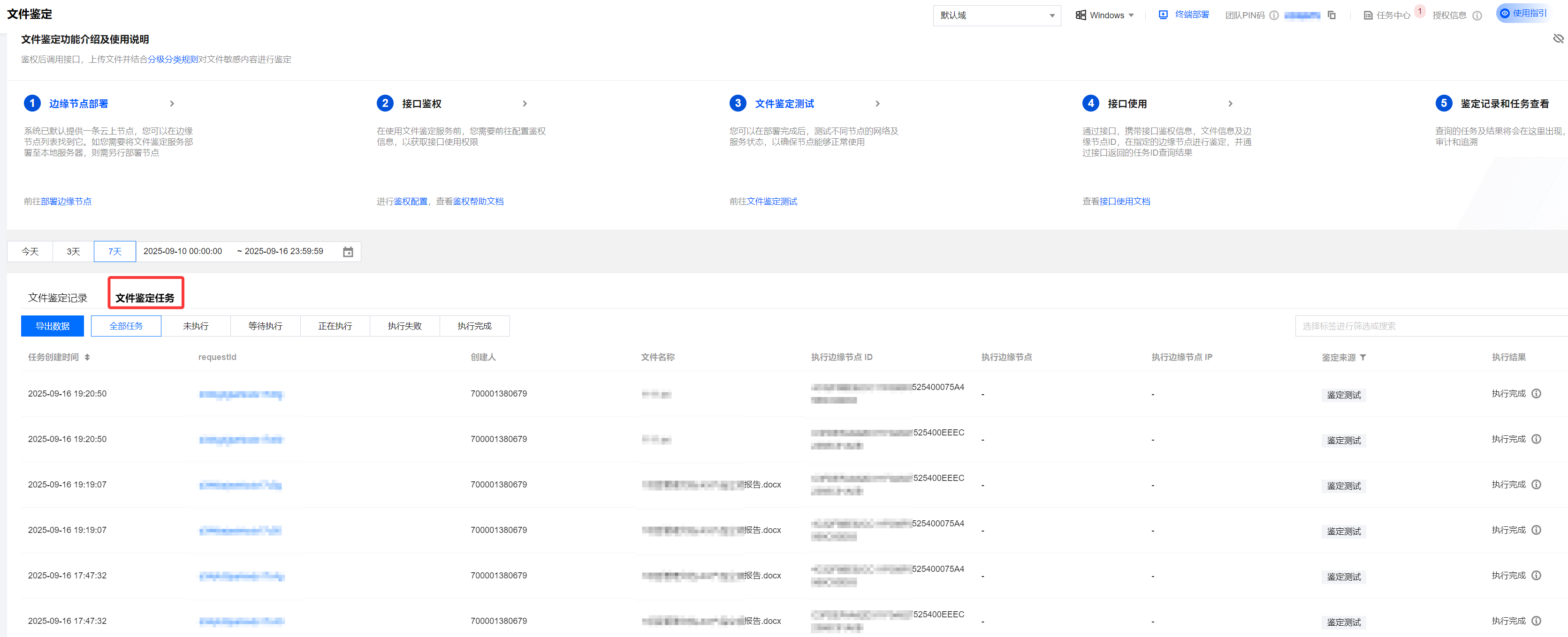 2. 在文件鉴定页面,选择文件鉴定任务,以“任务”为维度,实时展示所有鉴定请求的当前状态。管理员可通过此功能及其状态筛选器(全部任务/未执行/等待执行/正在执行/执行失败/执行完成):